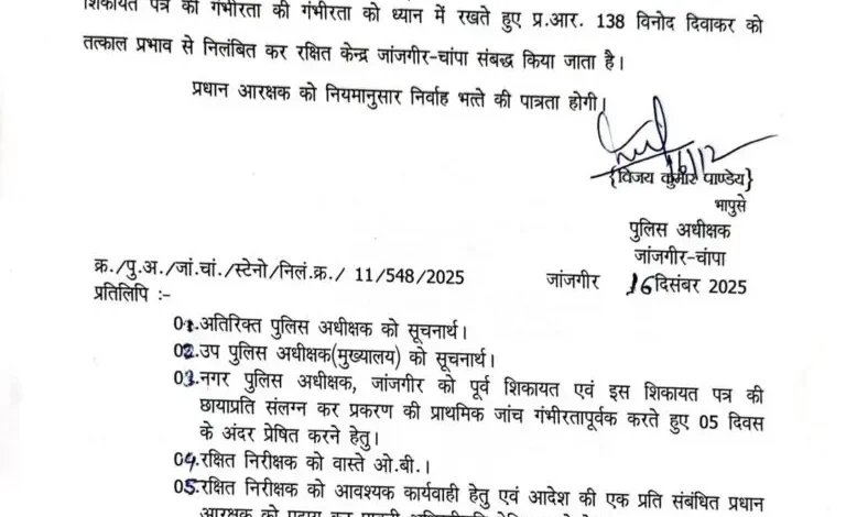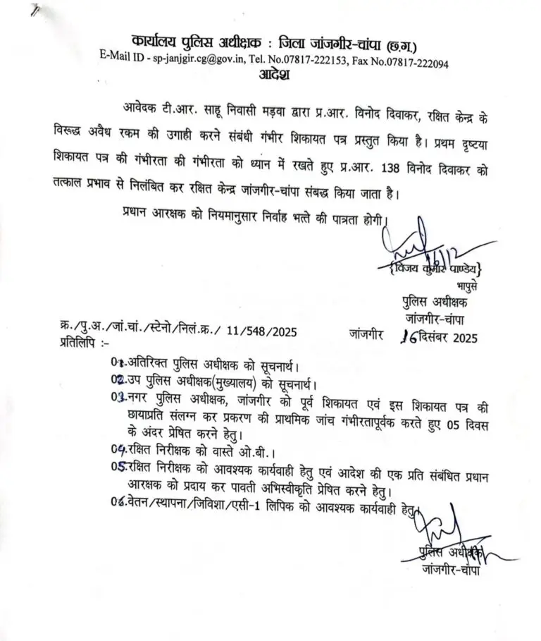 जांजगीर।न्यूज के प्रसारण के बाद एक बार फिर बड़ा असर देखने को मिला है। प्रधान आरक्षक पर रिश्वत लेने के गंभीर आरोप से जुड़ी खबर सामने आने के बाद पुलिस अधीक्षक विजय पाण्डेय ने त्वरित कार्रवाई करते हुए हेड कांस्टेबल विनोद दिवाकर को तत्काल प्रभाव से निलंबित कर दिया है।
