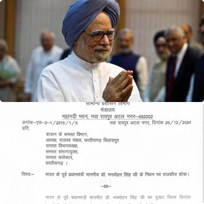 रायपुर। पूर्व पीएम डॉ मनमोहन सिंह के निधन पर छत्तीसगढ़ में राजकीय शोक को लेकर आदेश जारी हो गया है। मुख्यमंत्री विष्णु देव साय ने पूर्व प्रधानमंत्री डॉ. मनमोहन सिंह के निधन पर दुःख व्यक्त करते हुए कहा कि पूर्व प्रधानमंत्री, प्रख्यात अर्थशास्त्री डॉ. मनमोहन सिंह जी के निधन का समाचार अत्यंत दुःखद है।