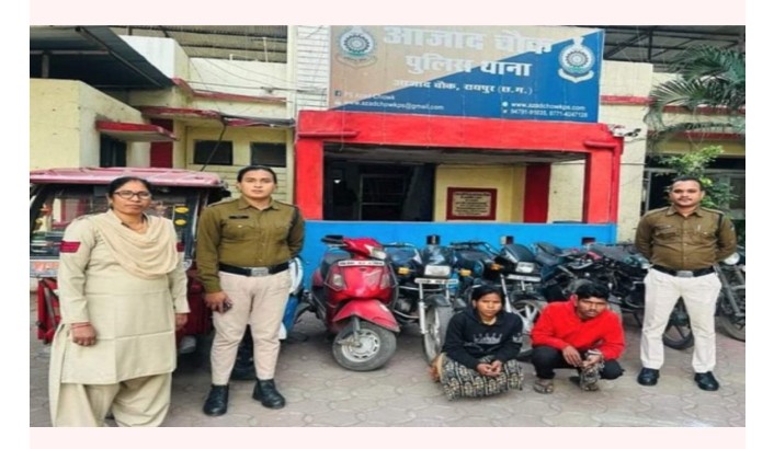 बता दें कि, आजाद चौक थाना क्षेत्र में लगातार वाहन चोरी हो रही थी. इस संबंध में पुलिस स्टाफ लगाकर लगातार आरोपियों की पतासाजी की जा रही थी. इस दौरान मुखबीर से सूचना प्राप्त हुई कि एक दंपति द्वारा मिलकर इन घटनाओं को अंजाम दिया जा रहा है. इसके बाद मुखबिर के बताए हुलिए को चिन्हांकित धर दबोचा.