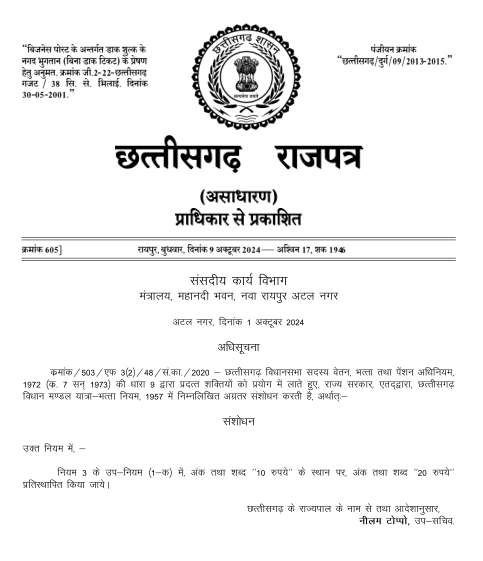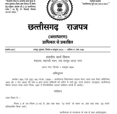 छत्तीसगढ़ के विधायकों को अब मिलेगा दोगुना यात्रा भत्ता, संसदीय कार्य विभाग ने जारी की अधिसूचना…