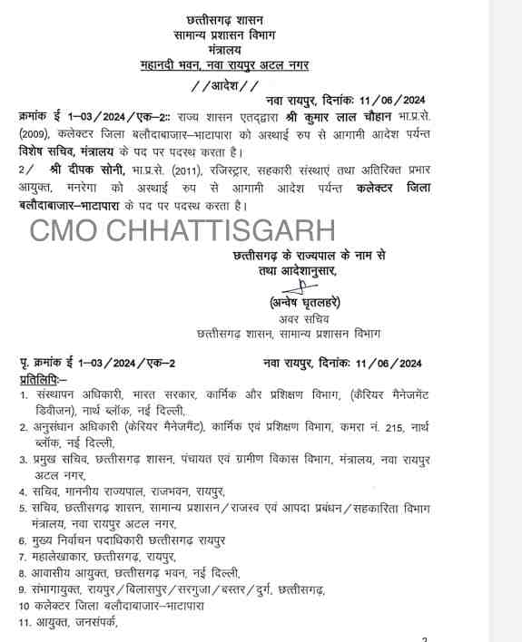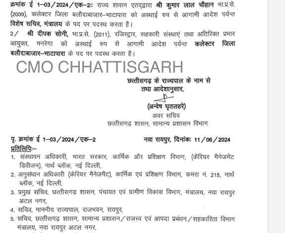 देर रात सामान्य प्रशासन विभाग की ओर से जारी आदेश के मुताबिक, कुमार लाल चौहान को अस्थाई रुप से आगामी आदेश तक विशेष सचिव, मंत्रालय के पद पर पदस्थ किया गया है. आईएएस दीपक सोनी रजिस्ट्रार, सहकारी संस्थाएं तथा अतिरिक्त प्रभार आयुक्त, मनरेगा को अस्थाई रूप से आगामी आदेश तक कलेक्टर जिला बलौदाबाजार-भाटापारा के पद पर पदस्थ किया गया है.
