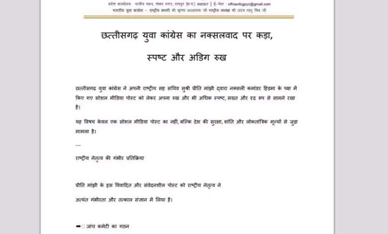 Congress Action : रायपुर, छत्तीसगढ़: युवा कांग्रेस (Youth Congress) की राष्ट्रीय सह सचिव प्रीति मांझी पर संगठन ने एक विवादित सोशल मीडिया पोस्ट को लेकर कड़ी कार्रवाई की है। कुख्यात नक्सली कमांडर माडवी हिडमा को ‘लाल सलाम कामरेड हिडमा’ कहकर श्रद्धांजलि देने वाले उनके पोस्ट पर विवाद गहराने के बाद, युवा कांग्रेस ने उन्हें पद से हटा दिया है।संगठन ने मामले की गंभीरता को देखते हुए उच्च स्तरीय कमेटी का गठन किया है और जांच पूरी होने तक प्रीति मांझी को उनके राष्ट्रीय सह सचिव के पद पर कार्य करने से अस्थाई रूप से रोक लगा दी गई है।