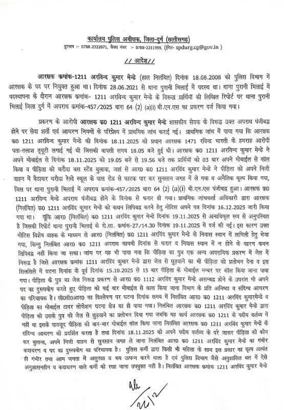 पीड़ित महिला ने पुलिस में दर्ज शिकायत में बताया कि उसका बेटा एक आपराधिक मामले में जेल में बंद है। इसी का फायदा उठाकर पुरानी भिलाई थाना क्षेत्र में पदस्थ आरक्षक अरविन्द कुमार मेन्ढे ने नवंबर 2025 में महिला को फोन कर थाने बुलाया और बेटे को जेल से छुड़ाने का झांसा दिया।