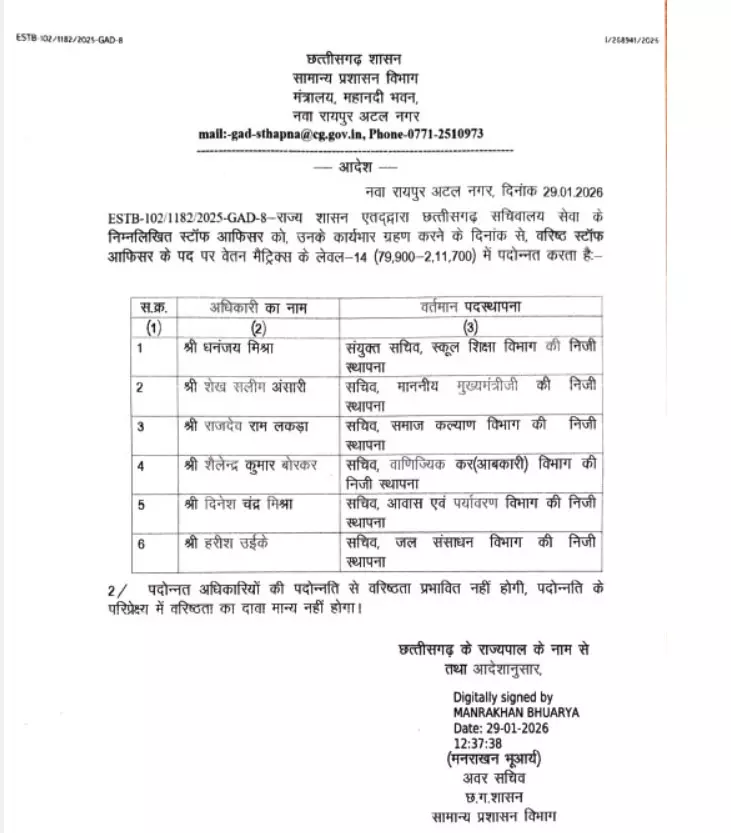 साप्रवि द्वारा जारी आदेश तत्काल प्रभावशील माना जाएगा। मंत्रालय स्तर पर हुए इस फेरबदल को नियमित प्रशासनिक प्रक्रिया का हिस्सा बताया जा रहा है, जिससे विभागीय कार्यों में गति और समन्वय बढ़ने की उम्मीद है।