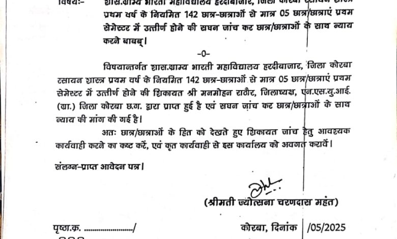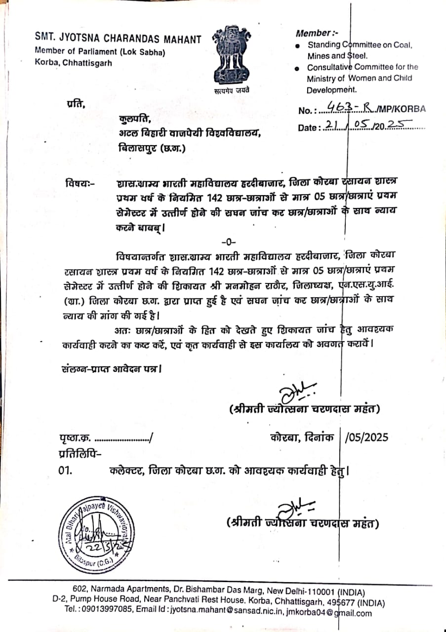 कोरबा – NSUI जिला अध्यक्ष मनमोहन राठौर कोरबा ने बताया कि अटल बिहारी बाजपेई विश्वविद्यालय छात्र/छात्राओं के भविष्य से खिलवाड़ कर रही है, मनमोहन ने बताया कि अटल बिहारी बाजपेई विश्वविद्यालय के द्वारा पूर्व में हुए परीक्षा का परिणाम शा.ग्रा.भा. महाविद्यालय के छात्र/छात्राओं का मनोबल गिराने का कार्य किया है, BSC प्रथम सेमेस्टर रसायन शास्त्र में 142 छात्रों में से 137 छात्रों में किसी को 0, 1, 2 या किसी को 5, या 7 नंबर दिया गया है, और अभी हाल ही में आए परीक्षा परिणाम में कुछ छात्रों को अफसेंट बताया गया है जबकि वह सभी छात्र परीक्षा दिए है, जिनका हाज़िरी रजिस्टर में हस्ताक्षर भी है, इसका मतलब यह हो रहा है कि अटल बिहारी बाजपेई विश्वविद्यालय चलते फिरते राहगीरों से या विश्वविद्यालय के पास ठेले लगाने वाले या फिर बेरोजगार युवको को कुछ पैसा दे कर उनसे ही पेपर चेक कराते होंगे, जो कि छात्रों के भविष्य के साथ खिलवाड़ है, मनमोहन राठौर ने यह भी बताया कि पूर्व में दिए गए परीक्षा परिणाम की सघन जांच के लिए कोरबा सांसद ज्योत्सना महंत द्वारा एवं मेरे द्वारा भी और मांग किया गया था मगर अभी तक छात्र हित में कोई भी गंभीर कदम नहीं उठाया गया, मनमोहन राठौर ने यह भी कहा कि शा. ग्रा. भा.महाविद्यालय के रसायन शास्त्र BSC -1 सेमेस्टर की उत्तरपुस्तिका के जांचकर्ता का नाम और वह कौनसे कॉलेज में पदस्थ है स्पष्ट करने की जरूरत है, मनमोहन राठौर का कहना है छात्रों के भविष्य के साथ खिलवाड़ करना बंद करे और छात्रों को न्याय दे, अन्यथा यूनिवर्सिटी परीक्षा नियंत्रण का घेराव करने के लिए NSUI को मजबूर होना पड़ेगा!!