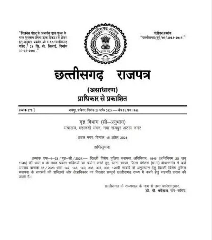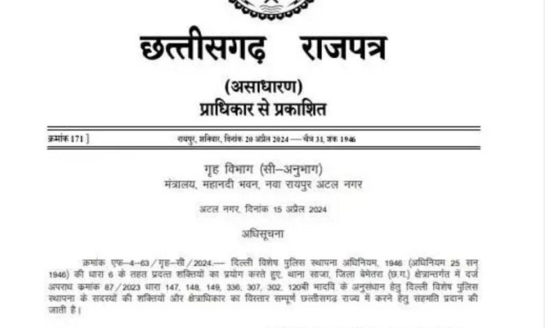 रायपुर। छत्तीसगढ़ की साय सरकार ने सीबीआई को पूरे राज्य में कार्रवाई करने का अधिकार देने से संबधित सहमति पत्र जारी कर दिया है. इसकी अधिसूचना छत्तीसगढ़ राजपत्र में प्रकाशित की गई है. बता दें कि राज्य सरकार की तरफ से जारी अधिसूचना के अनुसार सीबीआई प्रदेश में आईपीसी की धारा 147, 148, 149, 336, 307, 302 और 120बी के तहत राज्य की सीमा में कहीं भी कार्रवाई कर सकती है.