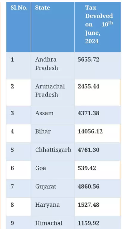 एनडीए सरकार के गठन के बाद पहली कैबिनेट बैठक में पीएम मोदी (PM Modi) ने कई बड़े फैसले लिए। वित्त मंत्रालय (Ministry of Finance) ने राज्यों को टैक्स डिवोल्यूशन की राशि भी ट्रांसफर की है। वित्त मंत्री निर्मला सीतारमण (Nirmala Sitharaman) ने पदभार संभालने के तुरंत बाद बड़ा फैसला लेते हुए देश के सभी राज्यों को कुल 1,39,750 करोड़ रुपये का टैक्स डिवोल्यूशन (Tax Devolution) जारी करने को हरी झंडी दिखाई। इसके तहत सबसे ज्यादा पैसा 25,069 करोड़ रुपये उत्तर प्रदेश (Uttar Pradesh) को दिया गया है। वहीं बिहार 14,000 करोड़ रुपये दिये गए हैं. केंद्र की ओर से UP को 25,069.88 करोड़ रुपये दिए हैं। वहीं गठबंधन के मजबूत सहयोगी नीतीश कुमार के नेतृत्व वाला बिहार दूसरे नंबर पर है। वित्त मंत्रालय ने Bihar के लिए 14,056.12 करोड़ रुपये ट्रांसफर किए हैं। इस लिस्ट में सबसे ज्यादा पैसा पाने वाला तीसरा राज्य मध्यप्रदेश (MP) है और इसके लिए 10,970.44 करोड़ रुपये ट्रांसफर किए गए हैं। जबकि छत्तीसगढ़ को 4,761 करोड़ रुपये वित्त मंत्रालय ने दिये हैं। वित्त मंत्रालय ने राज्यों को टैक्स डिवोल्यूशन की राशि में सबसे कम राशि छोटे राज्य सिक्किम को दिये हैं। वित्त मंत्रालय ने सिक्किम को 542 करोड़ तो गोवा के लिए 539 करोड़ रुपये जारी किए है। वहीं मिजोरम को 698 करोड़ और नागालैंड को 795 करोड़ रुपये मिले हैं।