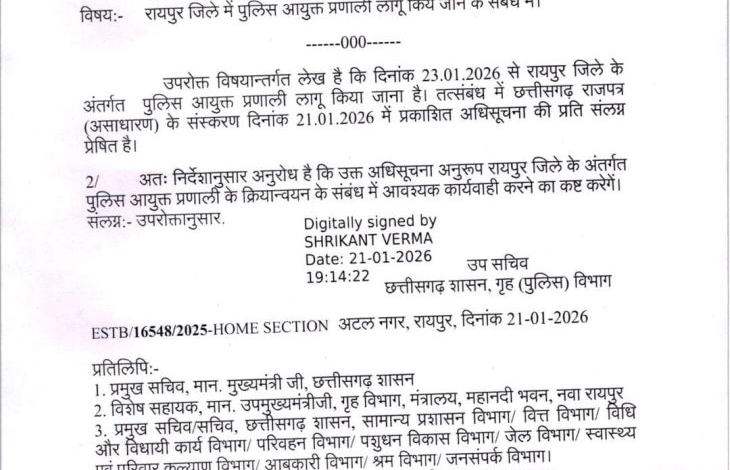 रायपुर। छत्तीसगढ़ की राजधानी में अपराध नियंत्रण और सुरक्षा व्यवस्था को अत्याधुनिक बनाने की दिशा में शासन ने बड़ा कदम उठाया है। रायपुर में अब पुलिस कमिश्नर प्रणाली (Police Commissionerate System) लागू कर दी गई है। गृह (पुलिस) विभाग द्वारा जारी अधिसूचना के अनुसार, यह नई व्यवस्था 23 जनवरी 2026 से प्रभावी होगी।