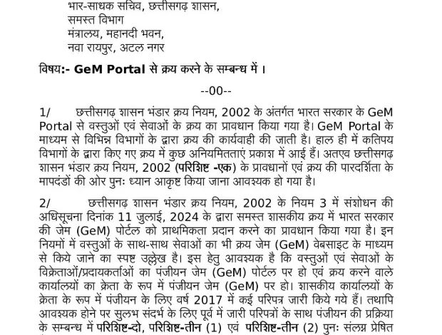 रायपुर। छत्तीसगढ़ सरकार ने शासकीय खरीदी प्रक्रिया में पारदर्शिता और अनुशासन सुनिश्चित करने के लिए बड़ा कदम उठाया है। राज्य सरकार ने सभी विभागों को आदेश जारी किया है कि अब सभी वस्तुओं और सेवाओं की खरीदी जेम (GeM) पोर्टल के माध्यम से ही की जाए।