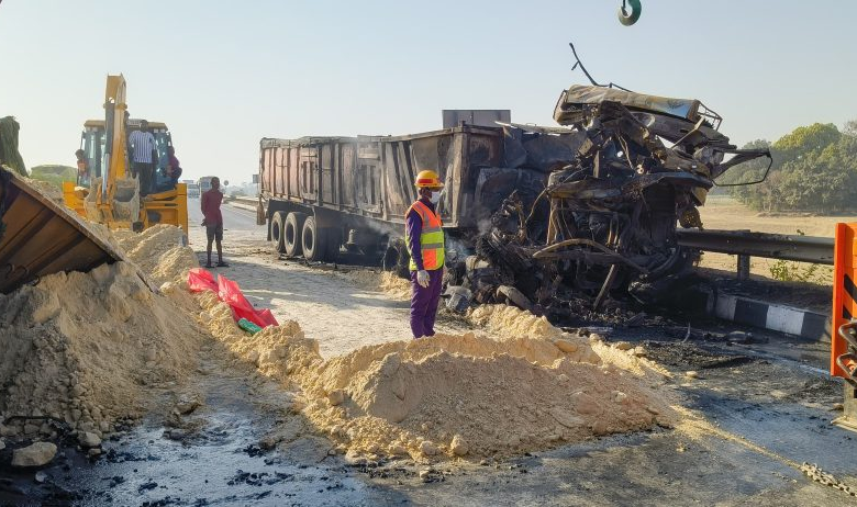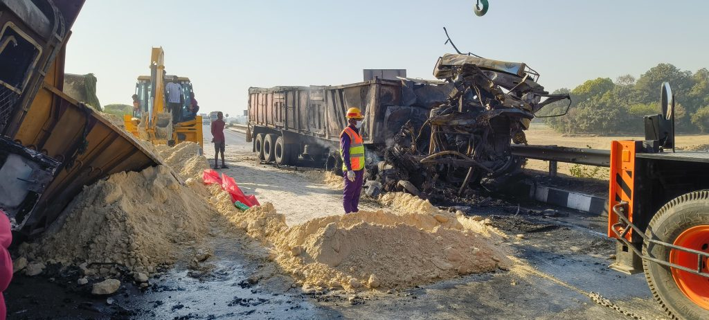 ट्रेलर ने जिप्शम से भरे ट्रक को मारी टक्कर, चालक की जलकर मौत
