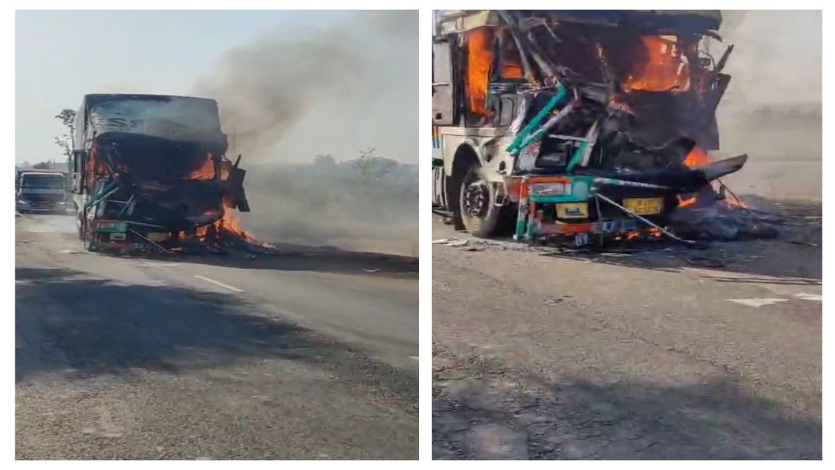 ट्रक का टायर फटने से अचानक लगा ब्रेक, पीछे से टकराया कंटेनर, लगी आग