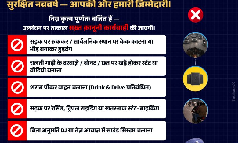 पुलिस ने स्पष्ट किया है कि शराब पीकर वाहन चलाने, तेज रफ्तार, स्टंटबाजी, हुड़दंग करने, सड़क पर केक काटने और तेज डीजे बजाने वालों के खिलाफ सख्त कार्रवाई की जाएगी। यातायात व्यवस्था को सुचारु बनाए रखने के लिए ट्रैफिक पुलिस की विशेष तैनाती की गई है और आवश्यकता पड़ने पर मार्ग परिवर्तन भी लागू किए जाएंगे।