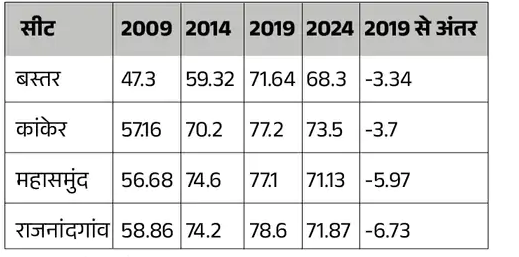 बस्तर, कांकेर, महासमुंद और राजनांदगांव में साल 2019 की अपेक्षा कम मतदान हुआ है। आंकड़ों में देखें तो बस्तर में 3.34, कांकेर में 3.7, महासमुंद में 5.97 और राजनांदगांव में 6.73 प्रतिशत कम वोटिंग हुई है। मतदान दल के शत प्रतिशत वापस आने के बाद आंकड़ा बढ़ने का दावा निर्वाचन आयोग के अधिकारी कर रहे हैं।